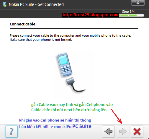 Gắn sẵn Cable kết nối điện thoại với PC rồi sau đó cài đặt phần mềm PC_suite và thực hiện như các hình bên dưới